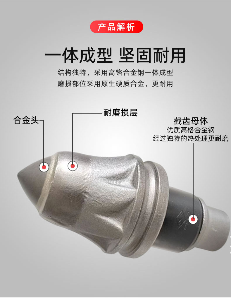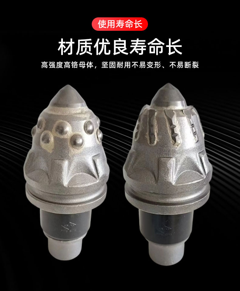 產品簡介:截齒特點:1、硬質合金刀頭采用低鈷材料,硬質合金刀頭更大,耐磨性更強。2、先進的加工工藝,保證硬質合金刀尖的高品質。3、硬質合金刀頭在鉆孔過程中具有更高的受力強度,減少斷齒或開裂的風險。4、鉆齒型譜豐富,針對不同地層,多種型號類型可供選擇。